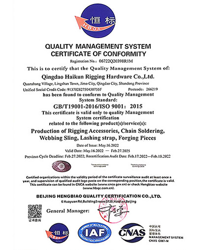Complete products, high quality, reasonable priceQingdao Haikun Hardware Co., Ltd. established in 1996, is one of the famous export-oriented processing enterprises in Qingdao. The products include more than 300 varieties, among which chains, Load Binders, US High-tensile Forged Shackles, Hooks, G80 products and webbing sling, lashing strap and tie down, etc. There are more than 150 staffs, and several production lines including 1000T...